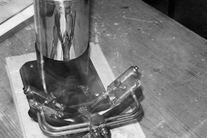 - La chaudière est entièrement en cuivre avec un recouvrement de lattes pour l'esthétique. Des cercles de laiton maintiennent le tout. Elle est équipée d'une soupape, d'un bouchon de remplissage et d'un bouchon latéral pour le manomètre. La cheminée est un tube en aluminium. De l'alcool à brûler est utilisé pour la chauffe. L'ensemble est constitué d'un réservoir avec bouchon de remplissage, d'un support de tuyauteries, d'un brûleur constitué de trois tubes recevant les mèches.